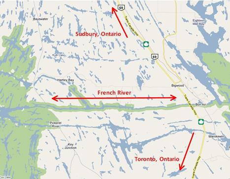 The French River is located approximately 320 km (200 miles) north of Toronto and only 50 km south of Sudbury. It leaves Lake Nipissing on a westerly route reaching Georgian Bay - Lake Huron. The French River is best described as a boating and canoeing paradise that provides a variety of opportunities to suit every taste.